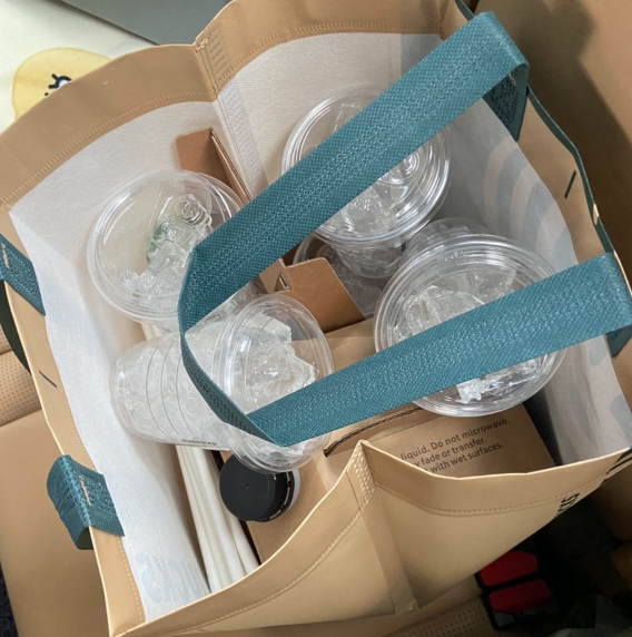 스타벅스 투고백은 단체 모임이나 행사 시 대용량 음료를 간편하게 준비할 수 있는 훌륭한 선택이었습니다. 다양한 음료 옵션과 함께 제공되는 부가 물품들로 인해 준비 과정이 한결 수월했습니다. 앞으로도 이러한 기회가 있다면 다시 이용하고 싶습니다.