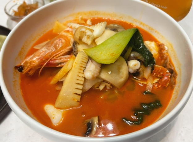 큼지막한 홍합, 오징어, 새우가 푸짐하게 들어가 있었고, 해산물의 신선함이 그대로 느껴졌어요. 국물을 한 숟갈 떠먹어 보니, 해물 육수의 깊고 진한 맛이 입안 가득 퍼지면서 감칠맛을 극대화시켜줬습니다. 국물이 깔끔하면서도 매콤한 맛이 적당히 어우러져 속을 편안하게 해주었고, 면발도 쫄깃해서 국물과 잘 어우러졌습니다.