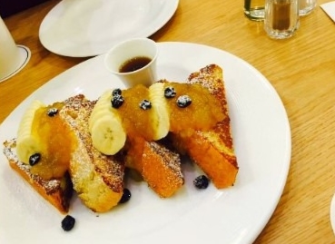 이날 제가 주문한 첫 번째 메뉴는 프렌치 토스트 세트였습니다. 달콤한 메이플 시럽이 듬뿍 뿌려진 두툼한 프렌치 토스트 위에는 신선한 과일이 올려져 있었어요.
