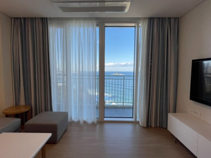 커튼을 걷으면 거실에서도 멋진 바다 전망을 즐길 수 있어서, 굳이 밖으로 나가지 않아도 속초의 아름다운 풍경을 실내에서 마음껏 감상할 수 있었습니다.
