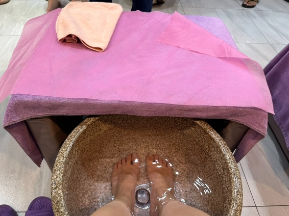 뜨끈한 물에 발을 담그고 있으니 하루 동안 쌓인 피로가 녹아내리는 듯했어요. 족탕이 끝난 후, 전문 마사지사가 발과 종아리를 집중적으로 마사지해주었어요.