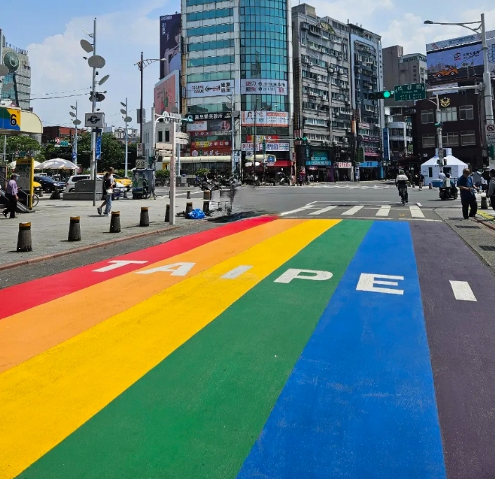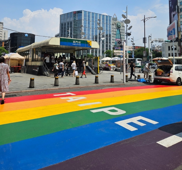 시먼홍러우에서 조금만 걸어가면 시먼딩역 6번 출구 근처에 위치한 작은 포토존이 등장합니다. 바로 무지개 횡단보도인데요, 알록달록한 색감이 돋보이는 이곳은 SNS 인증샷 필수 명소로도 유명합니다.