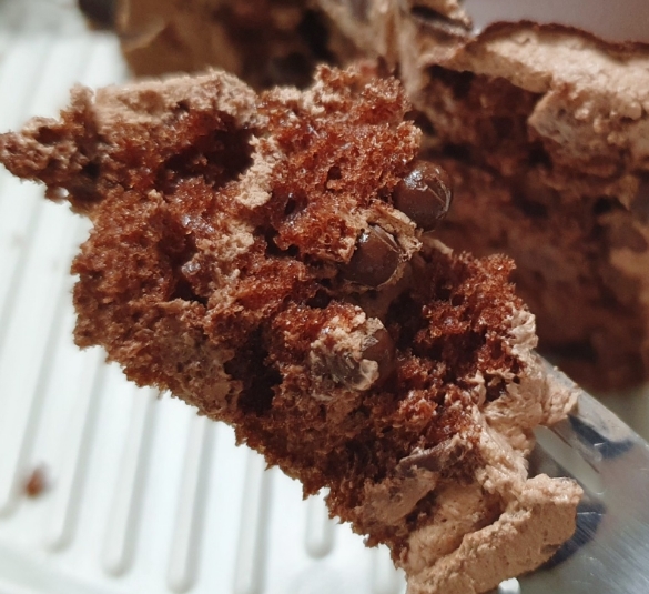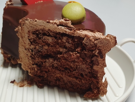 케이크의 바깥쪽에는 초콜릿 크림이 가득 감싸고 있고, 안쪽에는 초코 시트가 층층이 쌓여 있는 구조였어요. 한 조각을 떠서 먹어보니 진한 초콜릿 풍미가 입안 가득 퍼지면서, 부드러운 크림과 촉촉한 시트가 조화를 이루더라고요.