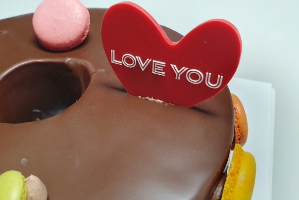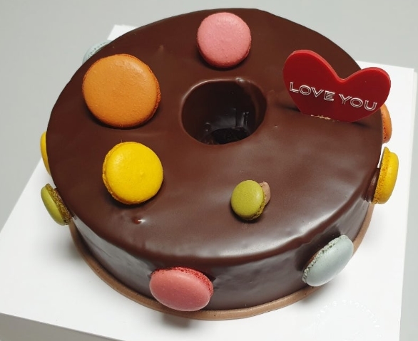 케이크 위에는 "LOVE YOU"라고 적힌 초콜릿 장식이 올려져 있어서, 기념일이나 생일 케이크로도 딱일 것 같았어요. 그리고 마카롱 꼬끄가 여기저기 박혀 있어서, 비주얼부터 이미 기대감이 상승했습니다.