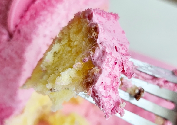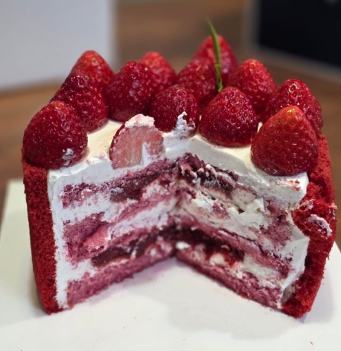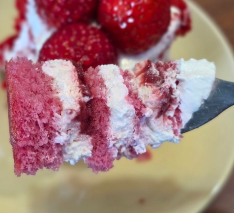 케이크 속을 자르자 분홍빛 딸기 스펀지 케이크와 생크림, 그리고 딸기 과육이 겹겹이 쌓여 있는 모습이 보였어요. 맛을 보니 크림이 과하지 않고, 딸기의 새콤달콤한 맛이 조화를 이루면서 너무나 부드러웠어요.