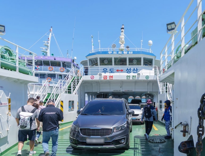 렌터카를 타고 성산항에 도착했다면, 주차 후 배를 타고 우도로 향하면 됩니다. 물론 차량을 배에 실어 우도로 가져갈 수도 있지만, 대부분의 경우 우도에서는 전기차를 대여해서 여행하는 것이 훨씬 편리하고 효율적이에요.
