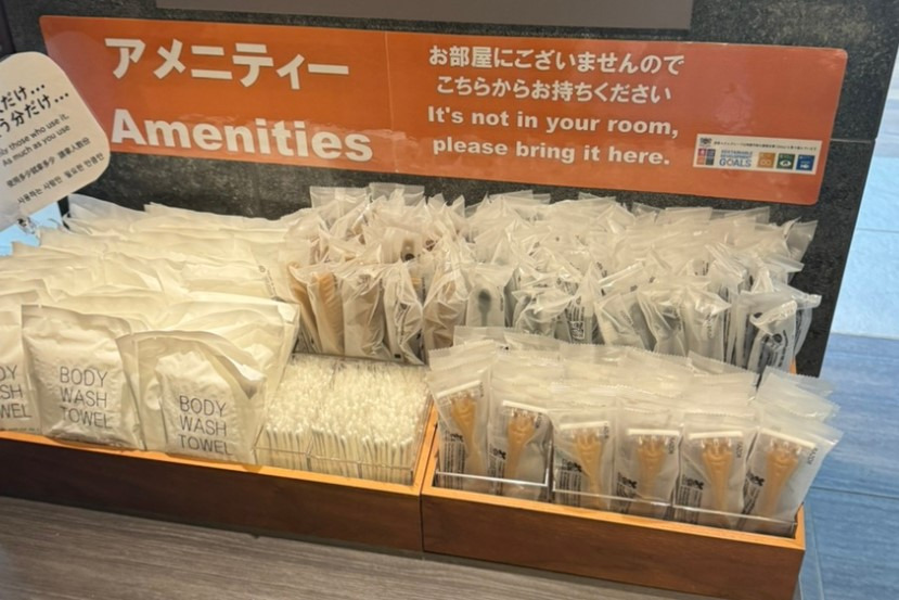 리셉션 뒤편에는 면도기, 칫솔, 면봉 등 필요한 용품들이 준비되어 있어, 언제든지 자유롭게 가져갈 수 있었습니다.