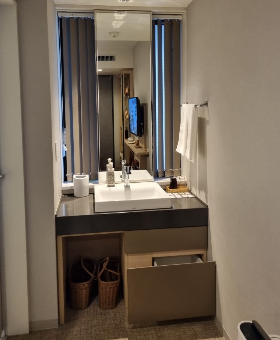 니시테츠 호텔 크롬 나고야의 세면대는 다소 낮게 설계되어 있었지만, 깔끔하고 청결한 느낌을 주었습니다. 저처럼 키가 큰 사람에게는 조금 불편할 수 있지만, 세면대 바로 옆에 거품 핸드워시도 제공되어 있어 위생적인 부분에서도 만족스러웠습니다.