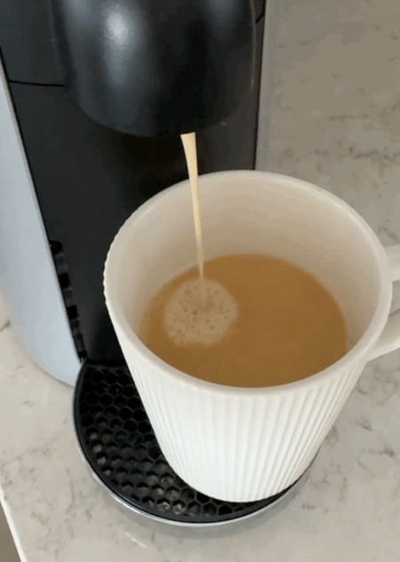 우유 캡슐을 먼저 넣고 머신 설정을 ‘물 5칸’으로 맞춰 추출해줍니다. 그러면 고소하고 부드러운 우유가 한 잔 완성됩니다. 이어서 커피 캡슐을 넣고 ‘물 1칸’으로 추출하면, 진한 커피 향이 퍼지며 위로 올라와 비주얼까지 완벽한 마키아토가 완성돼요.