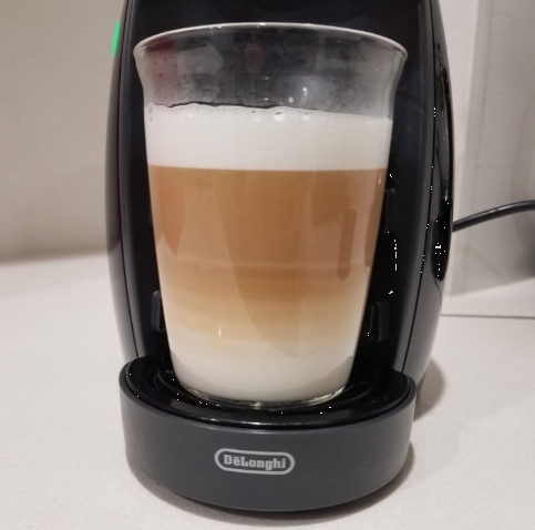 우유 캡슐을 물 5칸으로 먼저 추출한 다음, 커피 캡슐은 물 2칸으로 추출해줍니다.
