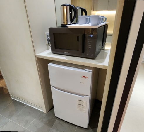 키즈룸은 취사가 불가능한 클린룸이지만, 간단하게 사용할 수 있는 싱크대와 전자레인지, 커피포트, 컵 등이 마련되어 있어 간식이나 우유 데우기에는 충분했습니다.