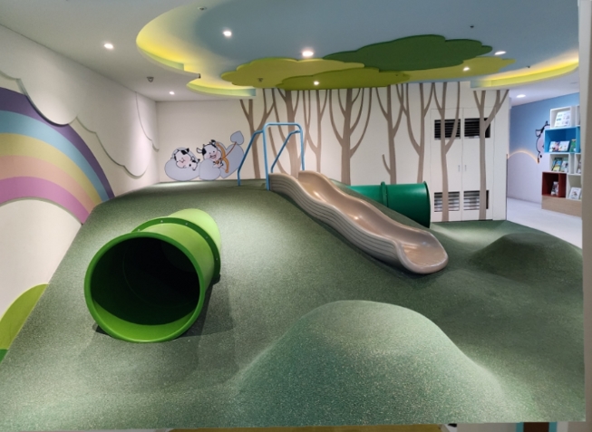 복도를 걷다 보니 중간에 갑자기 넓은 공간이 나왔고, 그 한가운데에는 미끄럼틀이 떡하니 자리 잡고 있었습니다. ‘복도에 놀이터라니, 이건 진짜 아이들 천국이구나’라는 생각이 절로 들었습니다.