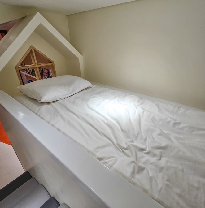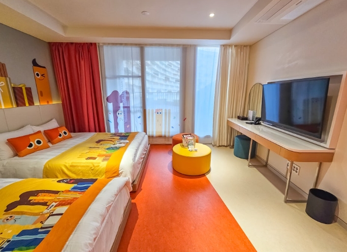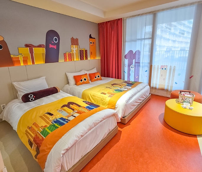 드디어 배정받은 객실에 들어섰습니다. 문을 열자마자 따뜻하고 포근한 느낌이 가득한 침실이 눈에 들어왔고, 가장 먼저 눈에 띈 건 캐릭터들이 반겨주는 침대 머리맡의 인테리어였습니다.