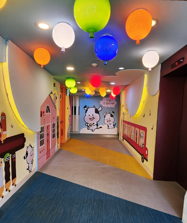 객실은 2층 키즈룸에 배정되었고, 엘리베이터에서 내리자마자 예상치 못한 광경에 순간 당황할 수밖에 없었습니다. 천장에 알록달록한 풍선들이 가득 달려 있었고, 벽면엔 귀여운 캐릭터들이 그려져 있어 마치 테마파크에 온 것 같은 기분이었어요.