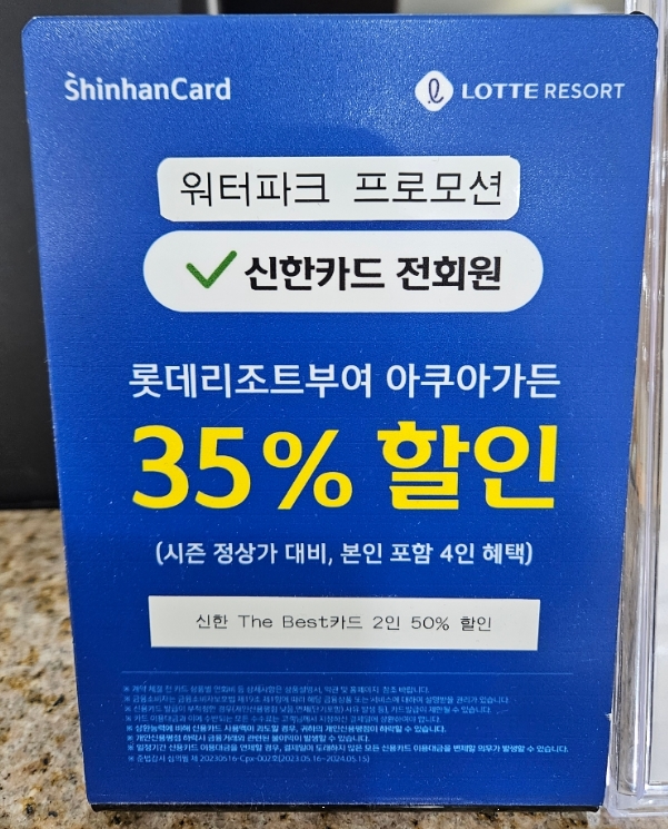 아쿠아가든은 다양한 할인 혜택이 있어 조금 더 알뜰하게 이용할 수 있었어요. 저희는 리조트 투숙객 할인으로 50% 할인을 받았고, 만약 신한카드를 사용하시면 35% 할인도 적용되니 미리 체크해보시는 걸 추천드려요. 할인 덕분에 꽤 합리적인 가격에 물놀이를 즐길 수 있었답니다.