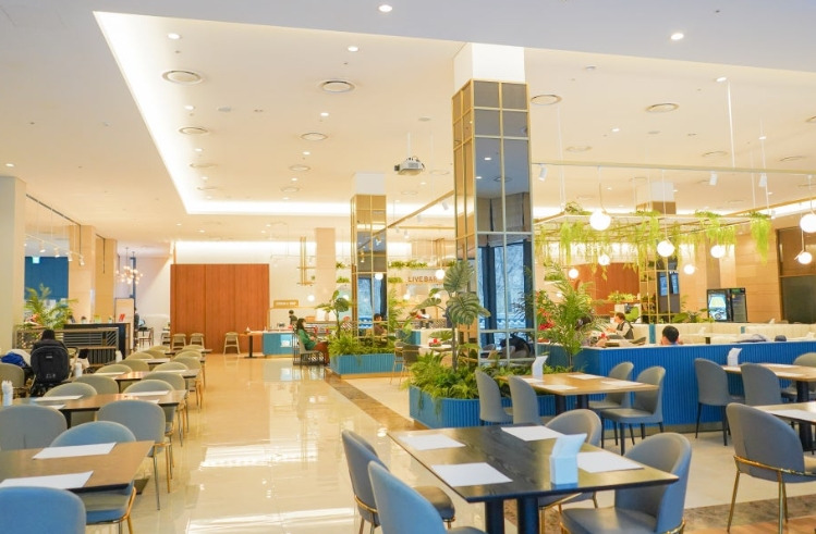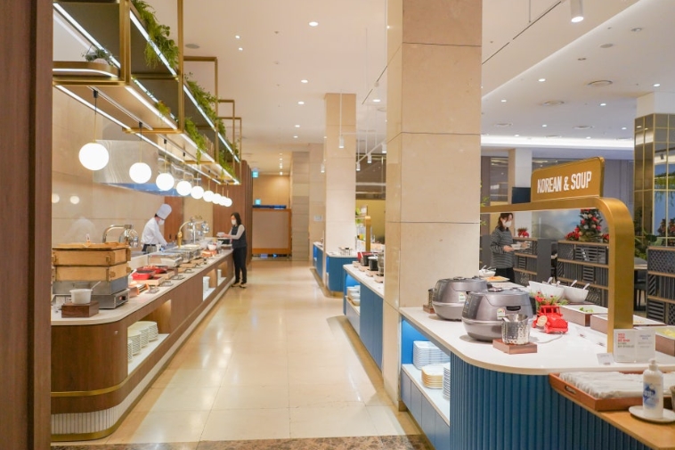 첫날 아침, 숙면을 취하고 일찍 일어난 우리는 부지런히 리조트 1층에 위치한 ‘본디마슬’로 향했습니다. 처음 레스토랑 문을 열고 들어섰을 때, 은은한 조명과 넓게 펼쳐진 뷔페 테이블, 깔끔하게 정리된 좌석들이 시선을 사로잡았습니다.