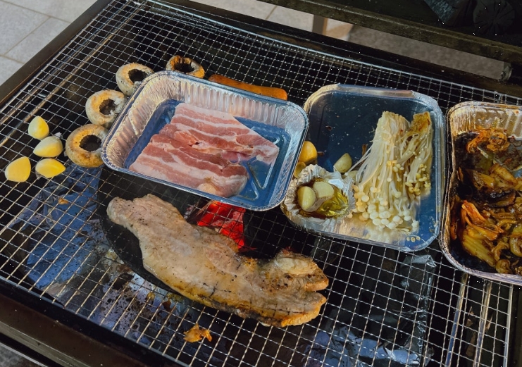 정경마당에 도착했을 땐 해가 지기 시작하는 시간이라 하늘이 붉게 물들고 있었고, 잔잔한 바람이 불어 분위기는 최고였습니다. 셋팅된 테이블은 깔끔했고, 숯도 직원분이 미리 챙겨주셔서 불 피우는 데 큰 어려움은 없었어요. 불이 잘 붙고, 고기 냄새가 퍼지기 시작하니 주변 사람들도 하나둘씩 웃으며 이야기꽃을 피우더라고요.