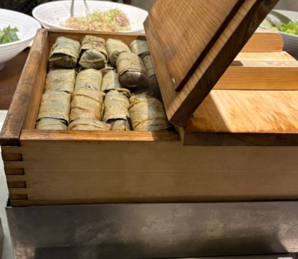 한식 코너에는 정말 다양한 메뉴가 준비되어 있었어요. 개인적으로 제일 먼저 손이 갔던 건 연잎밥이었습니다. 향긋한 연잎 안에 포슬포슬한 밥이 싸여 있었고, 그 고소한 향이 입맛을 돋워주더라고요.