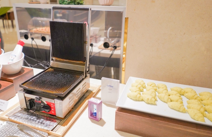 크루아상을 직접 와플 기계에 구워 먹는 ‘크로플’ 코너는 신의 한 수. 겉은 바삭하고 속은 촉촉한 크로플에 꿀과 잼을 곁들이니 디저트처럼 즐길 수 있었습니다.