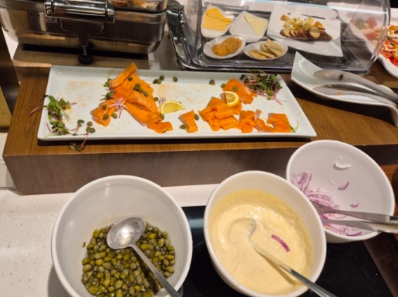 샐러드 바에는 훈제연어와 각종 채소, 발사믹과 유자 드레싱까지 다양하게 준비되어 있어 가볍고 건강한 식사도 가능했어요.