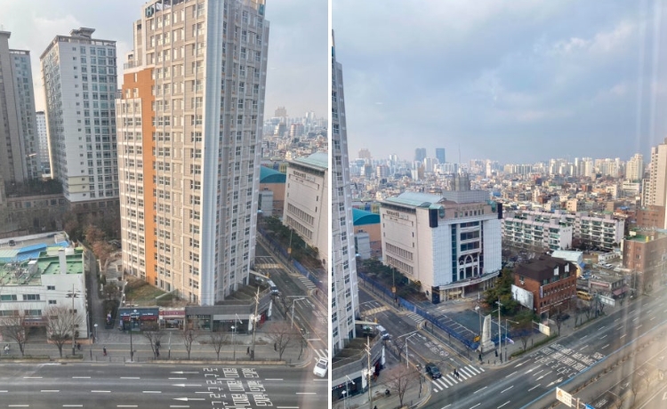 창밖으로는 동작구와 신도림 일대를 한눈에 볼 수 있는 시티뷰가 펼쳐져 여유로운 시간을 가질 수 있었습니다. 창가에는 소파와 탁자가 있어 경치를 감상하거나 간단한 스낵을 즐기기에 적합합니다.