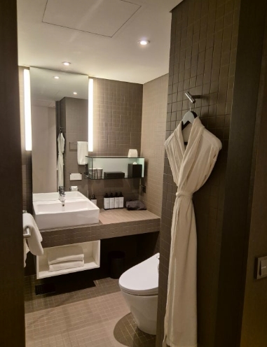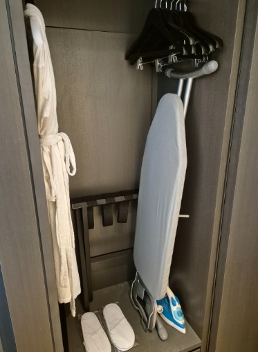 가운과 수건도 충분히 제공되어 편안한 휴식을 취할 수 있었습니다. 객실에는 다리미, 구두솔, 멀티탭 등 비즈니스 여행에 필요한 기본 용품이 비치되어 있어 매우 편리했습니다.