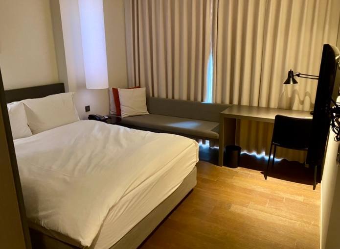 스탠다드 더블룸은 단단하고 안정감 있는 침대가 제공되어 편안한 잠자리를 보장합니다. 방의 크기는 크지 않지만, 전체적으로 깔끔하고 현대적인 분위기를 유지하고 있습니다.
