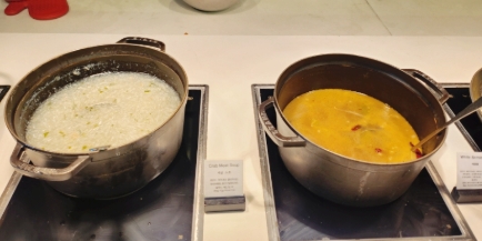 조식 뷔페의 매력 중 하나는 매번 새로운 메뉴를 발견하는 것이죠. 이번에는 게살죽과 딤섬 코너를 새롭게 발견했어요.