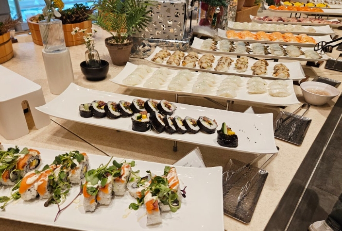 개인적으로 가장 좋았던 건 사시미와 스시 코너였어요. 참치, 연어, 광어, 우럭 등 신선한 생선들이 가득했고, 현장에서 셰프님이 직접 만들어주는 스시를 먹는 재미도 쏠쏠했어요.