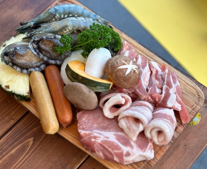 저희는 돼지 한 마리 세트(600g, 80,000원) 를 주문했는데, 삼겹살, 가브리살, 목살, 항정살과 씨푸드가 골고루 나와서 질리지 않고 다양하게 먹을 수 있었어요.