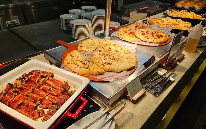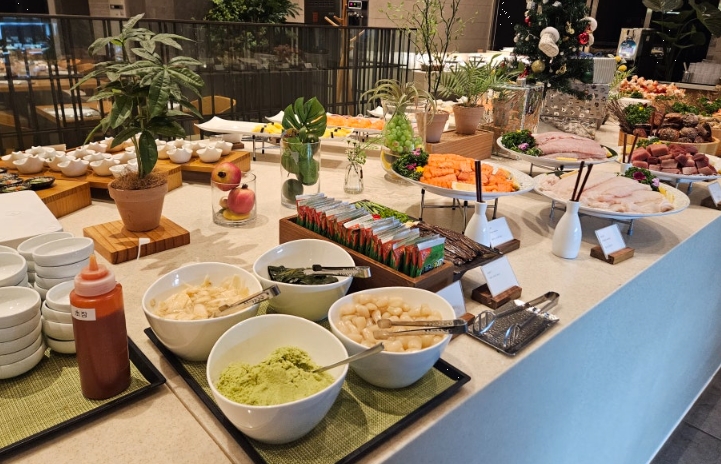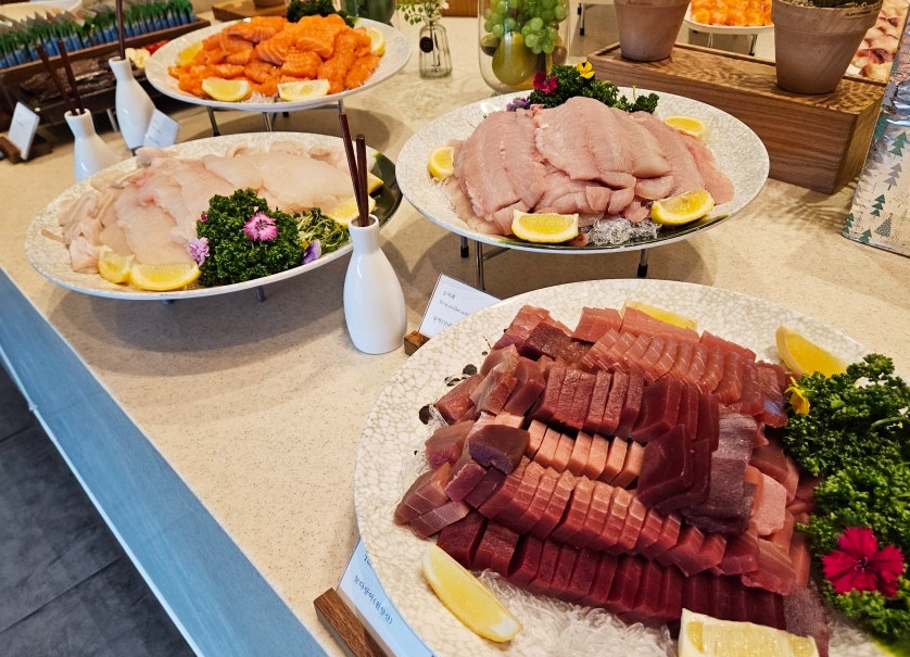 개인적으로 가장 좋았던 건 사시미와 스시 코너였어요. 참치, 연어, 광어, 우럭 등 신선한 생선들이 가득했고, 현장에서 셰프님이 직접 만들어주는 스시를 먹는 재미도 쏠쏠했어요.