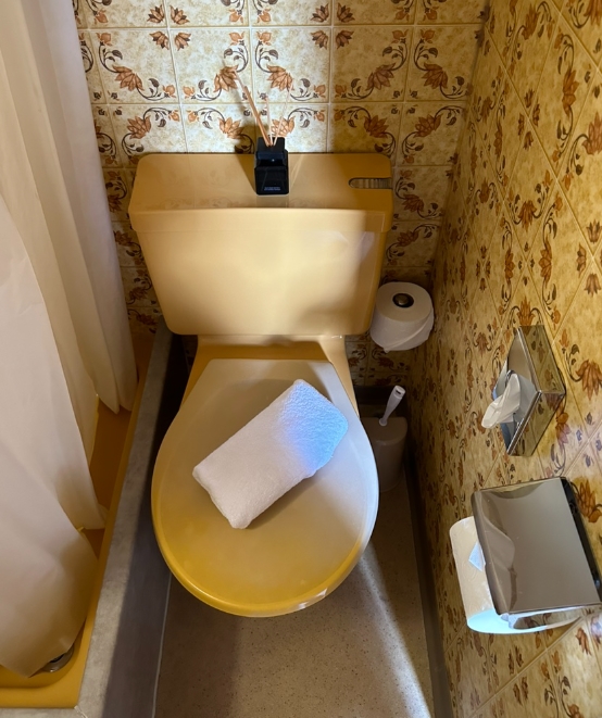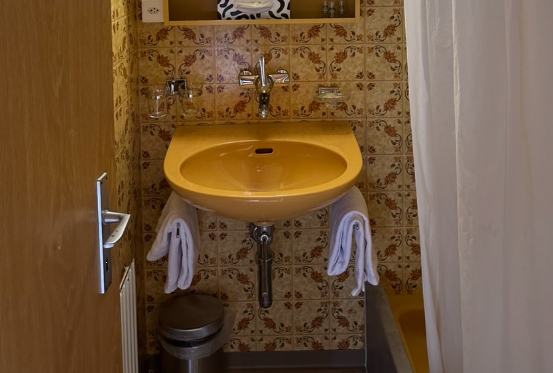 욕실도 정말 깔끔하고 인상 깊었는데요, 노란색 세면대와 연노랑 타일이 아기자기하면서도 귀여운 분위기를 자아냈습니다. 변기마저 연노랑색이라 욕실에서 기분이 절로 좋아졌어요.