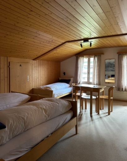 저희가 묵었던 객실은 트리플룸이었어요. 객실은 2층에 위치해 있었는데, 내부는 스위스 전통 샬레 스타일의 감성이 물씬 느껴지는 따뜻하고 아늑한 분위기였습니다. 무엇보다도 3명이 사용하기에 넉넉한 공간이 인상적이었어요. 침대는 싱글 침대 3개로 구성되어 있었고, 각 침대마다 침구도 깔끔하게 정돈되어 있어 첫 인상부터 매우 좋았답니다.