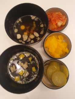 기본 반찬으로는 김치, 단무지, 피클과 함께 따뜻한 우동 국물이 나왔는데, 식사 전에 입맛 돋우기에 딱 좋았어요.