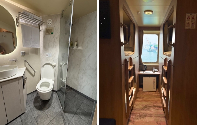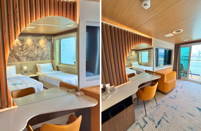 발코니 스위트 객실은 정박 중에는 항구가 보였지만, 항해 중에는 탁 트인 오션뷰를 감상할 수 있습니다. 객실 내부에는 커피머신과 다양한 어메니티가 준비되어 있어, 편안한 시간을 보낼 수 있습니다.