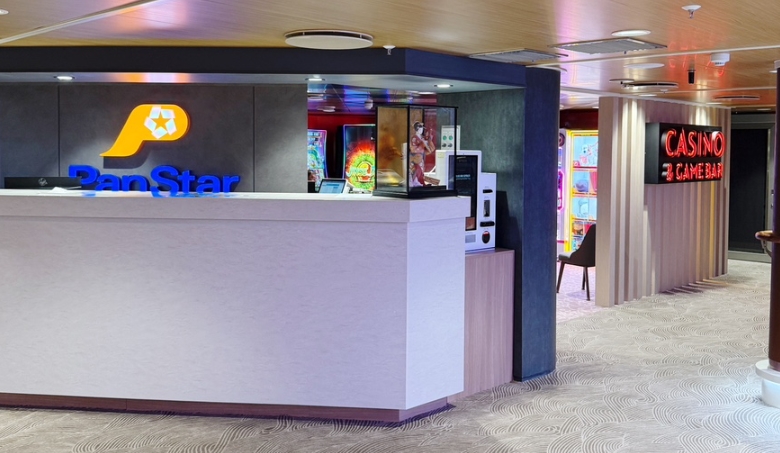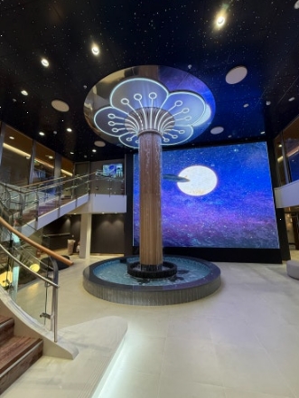 웅장한 로비 중앙에는 아름다운 분수가 설치되어 있어, 탑승객들에게 시각적인 즐거움을 제공합니다. 분수 뒤편에는 선상 게임룸이 위치해 있어, 다양한 게임을 즐길 수 있습니다.