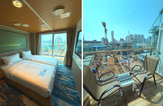 발코니 스위트 객실은 정박 중에는 항구가 보였지만, 항해 중에는 탁 트인 오션뷰를 감상할 수 있습니다. 객실 내부에는 커피머신과 다양한 어메니티가 준비되어 있어, 편안한 시간을 보낼 수 있습니다.