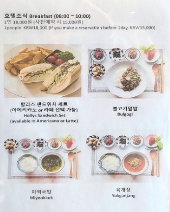엔브릿지 호텔에서는 조식을 매일 오전 08:00부터 10:00까지 즐길 수 있으며, 매일 제공되는 메뉴는 미리 구성된 4종류 중 한 가지를 선택하는 방식이었습니다.