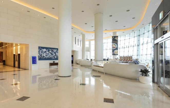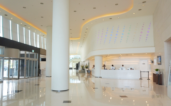 로비는 천장이 높고 넓은 공간감이 돋보였으며, 전면 유리창을 통해 들어오는 자연광과 바깥의 풍경이 마치 그림 같았습니다.