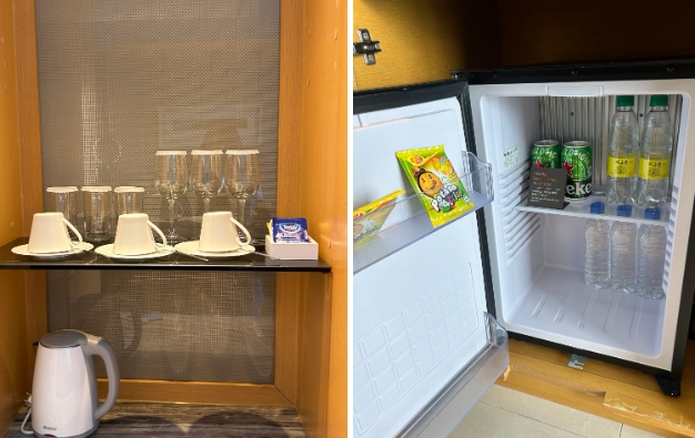 냉장고, 커피포트, 생수, 티백, 개인 금고, 헤어드라이어 등 기본적인 편의시설은 모두 갖춰져 있었고, 미니바에는 하이네켄 맥주, 탄산수, 감자칩 등 간단한 간식이 무료로 제공되어 편안한 밤 시간을 보낼 수 있었습니다.