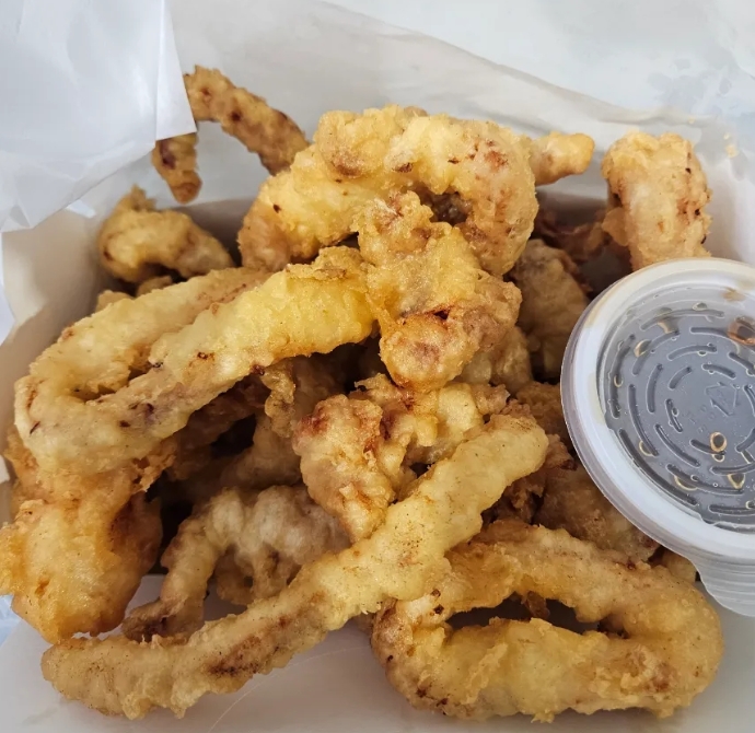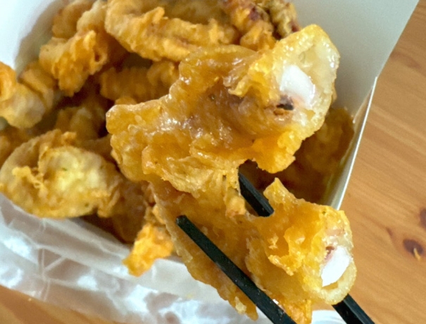 감자전분으로 반죽한 뒤, 얇고 바삭하게 튀겨낸 오징어튀김은 바삭함과 촉촉함을 동시에 자랑하는 매력적인 맛입니다.