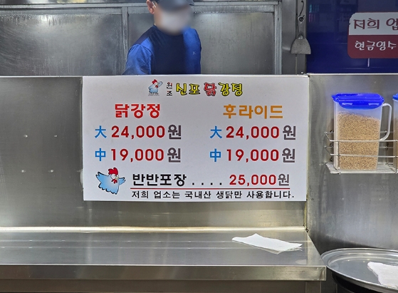 메뉴는 닭강정, 후라이드, 반반이 있으며, 우리는 대짜 사이즈(24,000원)를 주문했죠.
