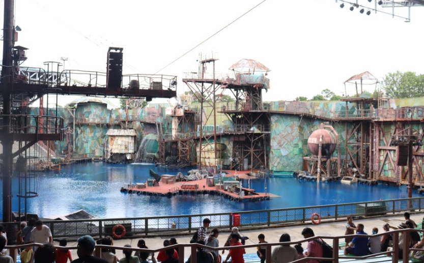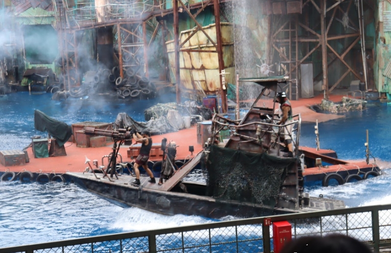 유니버셜 스튜디오에서 꼭 봐야 할 공연 중 하나는 바로 워터월드 쇼입니다. 영화 '워터월드'를 테마로 실제 물 위에서 펼쳐지는 스턴트 액션이 매우 생동감 넘쳤어요.