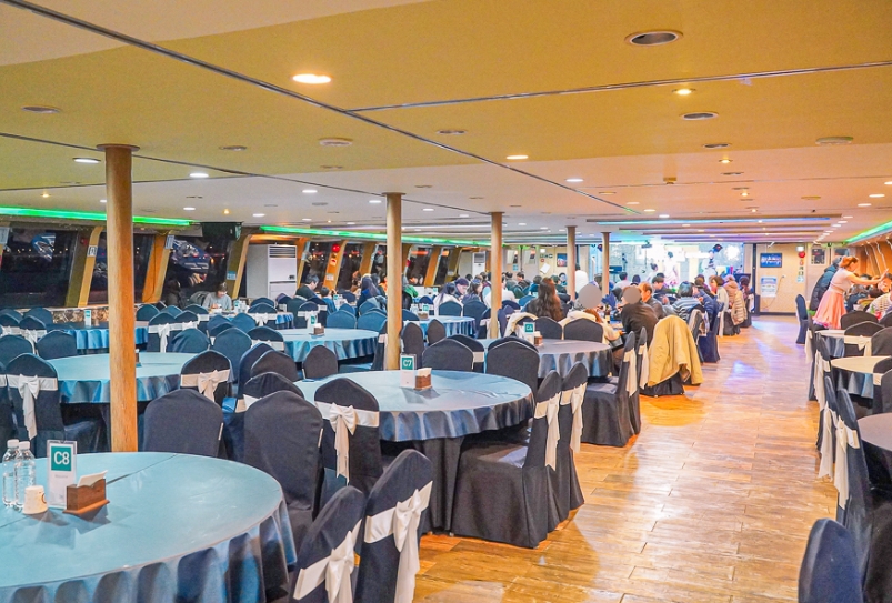 좌석은 지정제로 운영되어 편안하게 자리를 찾아 앉을 수 있어요. 연회석 스타일의 원형 테이블이 마련되어 있어 일행과 함께 담소를 나누기에도 좋고, 창밖으로 펼쳐지는 풍경을 감상하기에도 최적이었습니다.
