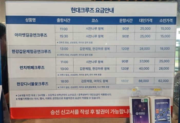 저는 이번에 1번 상품인 한강 디너 불꽃 크루즈를 선택했답니다. 갑문체험부터 한강을 따라 여의도까지 왕복 운항하며 저녁 노을과 야경을 감상할 수 있는 코스로 매우 인기 있는 상품이에요.