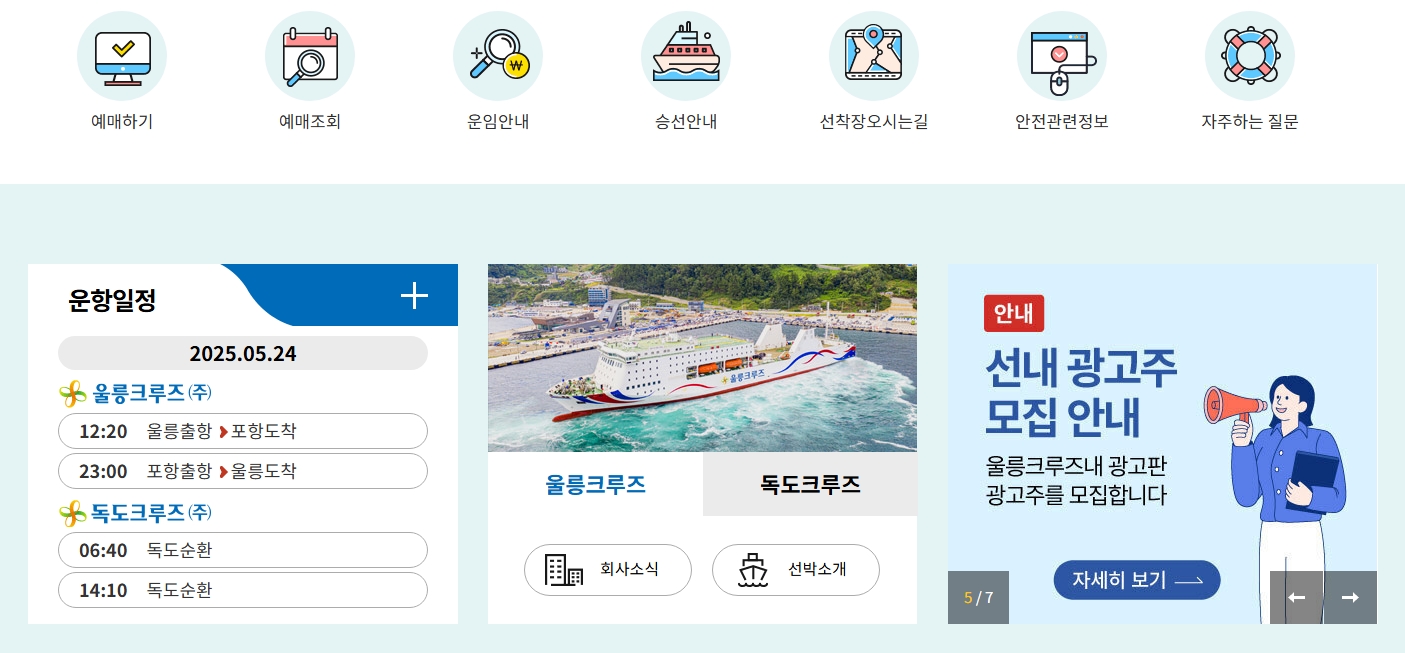 울릉크루즈 공식 홈페이지 또는 클룩에서 할인 예약할 수 있으며, 전화 예약도 지원돼요.