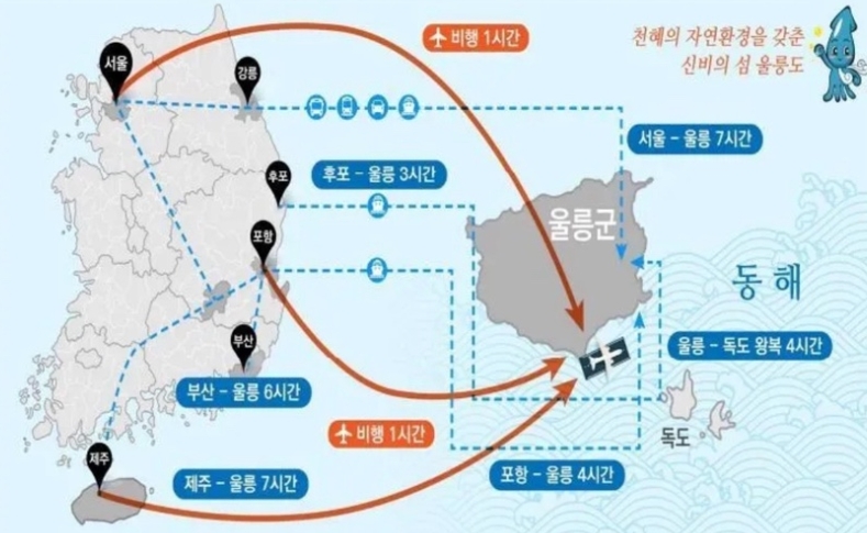 가장 놀라운 점은 바로 이동 시간의 획기적인 단축입니다. 지금은 서울에서 울릉도까지 이동하려면 기차와 선박을 포함해 최소 8~10시간 이상 걸립니다. 그런데 울릉공항이 개항하면 서울에서 울릉도까지 단 1시간 이내에 도착할 수 있게 되는 거예요.