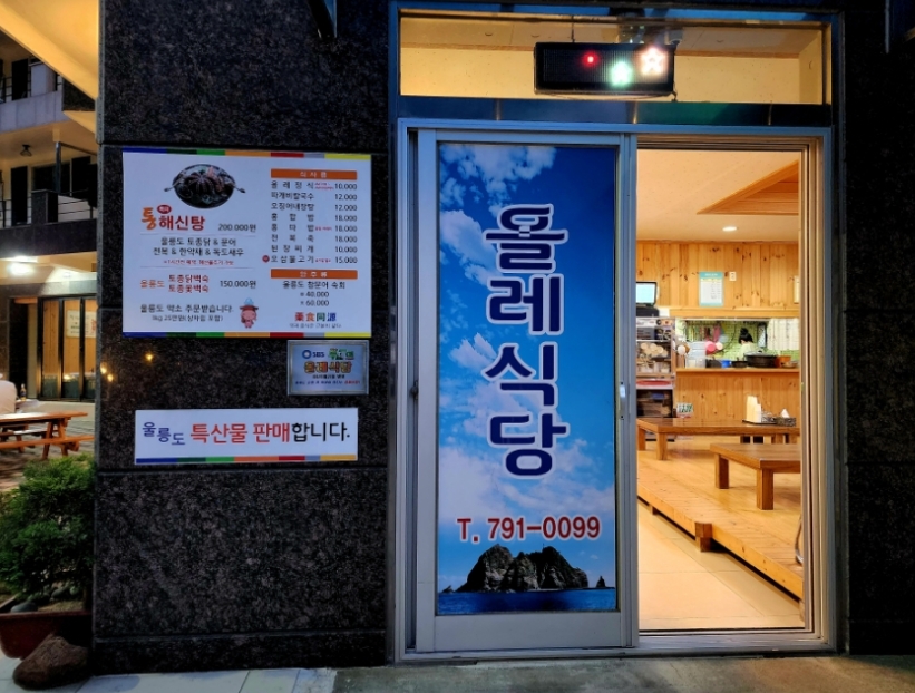 올레펜션의 1층에는 ‘올레식당’이 운영되고 있습니다. 이 식당은 울릉도 저동항에서도 맛집으로 알려져 있으며, 아침 7시부터 운영되어 조식 이용도 가능합니다.