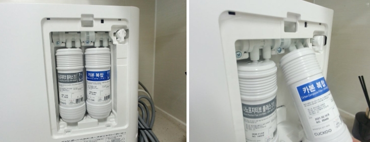 새 필터를 포장에서 꺼내 정해진 자리에 넣고 시계방향으로 돌리면 끝.