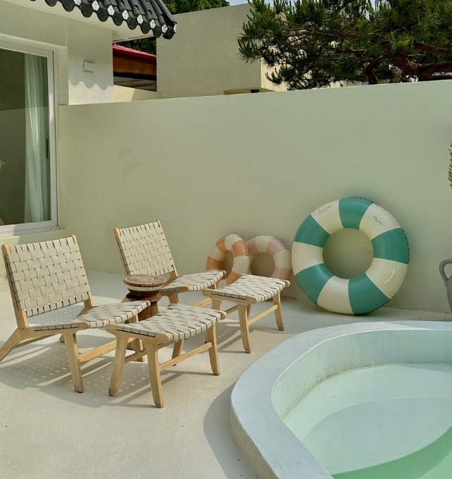 이 숙소의 하이라이트는 단연 야외 수영장입니다. 정원 옆에 자리해 있어 다른 투숙객의 시선을 신경 쓰지 않아도 되는 구조이고, 아담하지만 프라이빗하게 즐기기에 딱 좋았어요.